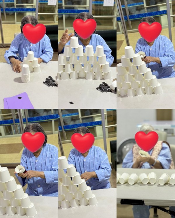 마음속에 있는 고민,화나는일 속상한일을 이야기하며 종이를 찢어 폭죽을 터트리고.종이컵을 이용하여 높은 탑을 쌓으며 폭죽으로 무너트는 활동을 통해 어르신들의 스트레스 해소와 정서적 안정을 도왔습니다.