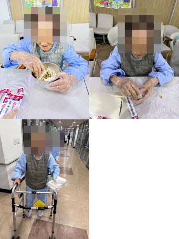 주먹밥 만드는 방법을 하나씩 설명드리고, 직접 모양을 빚으며 여러 재료를 섞어보기도 하자 점차 분위기가 밝아졌습니다. 처음에는 “혼자 먹을 거야”라고 말씀하시던 어르신들께서도 포장 용기에 담으며 옆 침대 어르신과 나누어 드시고, 간병사 선생님들과 함께 먹겠다며 정성껏 주먹밥을 만드시는 모습이 인상적이었습니다.