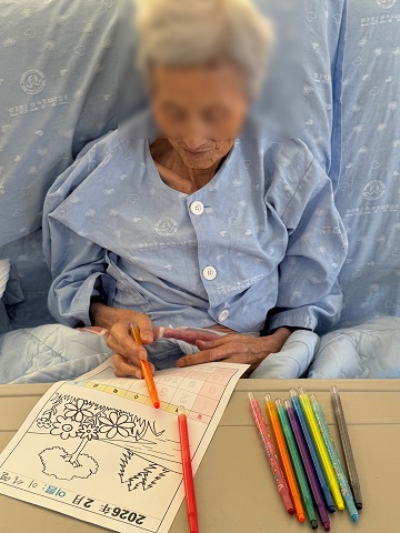 처음에는 색칠하다가 선을 넘을까, 그림을 망칠까 조심스러워 날짜만 따라 끄적이시며 주춤주춤하셨지만, “괜찮아요”라는 말 한마디에 용기를 내어 천천히 색을 채워 나가셨습니다.